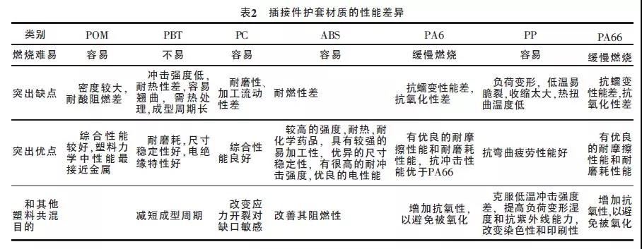 要根据不同的需求选择不同材质的插接件(各种材质的具体性能差异见表2)。可根据实际情况在塑料中添加阻燃或增强材料, 以达到增强或阻燃的目的, 如添加玻璃纤维增强等, 如离发动机舱高温部位的插接件应选用耐高温的尼龙护套;