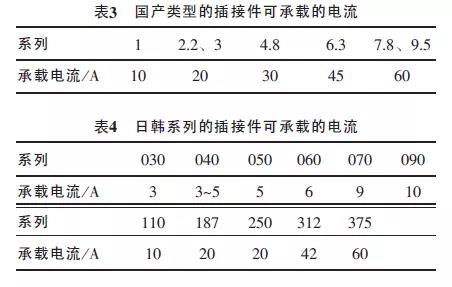 不同规格的插接件可承载的电流参见表3 (国产类型) 及表4 (日韩系列)。另外, 若用电设备供应商提供的插接件不满足性能要求, 则设计师有权要求其重新选择, 或由线束端确定用电设备端插接件的型号。